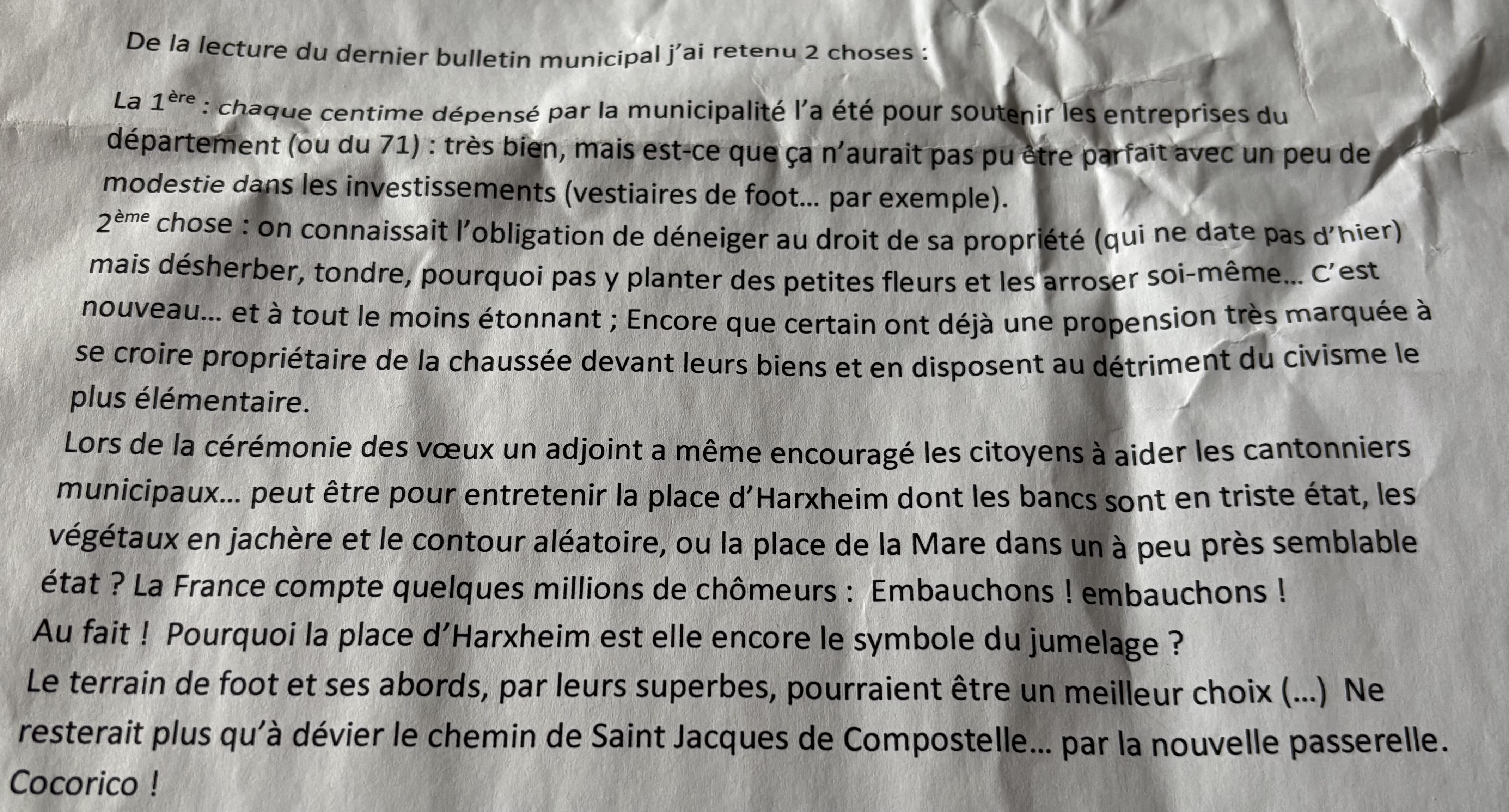 Sieur Doblan, pour le plaisir des glorious et des coucous veuillez noter s’il vous plaît si « la municipalité SOUTIENT des entreprises » c’est étonnant. Peut-être une originalité de l’équipe sortante? Au fait êtes-vous inscrit sur la liste électorale? Votre identité n’y figure pas. Nombre de trottoirs même tout neufs sont hélas, utilisés pour garer sa voiture difficile de lutter contre l’incivilité pourtant ‘ils’ ont un garage!. La place de l’église est un exemple de dangerosité qui s’aggrave, c’est comme çà…. L’entretien des trottoirs riverains sont régis par la loi, renseignez-vous…Quant au jumelage il faut avoir subi ou vécu la Seconde Guerre Mondiale et/ou d’autres conflits pour comprendre son maintien. Enfin notez cher monsieur qu’une ramification du chemin de Compostelle passe par notre village : la route de Saussy. En toute cordialité – clkayser. LA VIGIE CITOYENNE. |