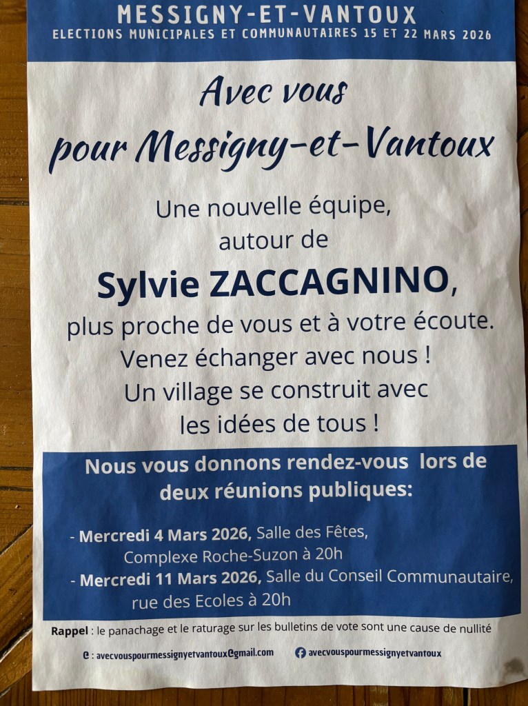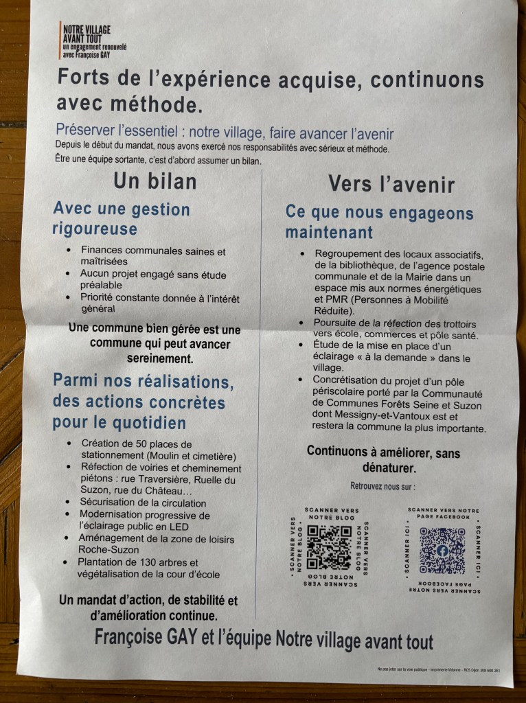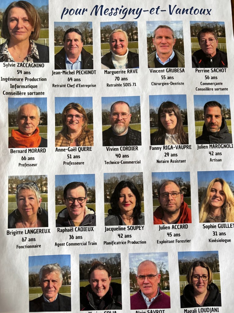 Notre village avant tout », pour la petite histoire locale: au mois d’août 1995 une grande banderole tendue Grande rue annonçait « A Messigny on vend tout ». Ceci dans le cadre d’un brocante organisée par les « ripeurs » dijonnais. Curiosité? Sébastien BON 52 ans, conseiller sortant – Jean Michel BUGEON 68 ans, conseiller ‘spécial’ sortant, – Olivier COUTURE 61 ans, conseiller sortant – Françoise GAY 70 ans, maire sortante – Léa GOVIN 35 ans – Bernard HEME 69 ans – Béatrice LAFORET 65 ans – Laurence LAGARDE 64 ans – Céline LEBROT 49 ans – Philippe MARANDE 56 ans, conseiller sortant – Virginie MARIAGE 52 ans, conseillère sortante – Jean Paul MASSILLON 64 ans – Régine MAURAIS 64 ans – Véronique METIN-DETE 66 ans – Serge MOUCHON 80 ans, 1° adjoint sortant – Christiane PAUTRAS 76 ans, conseillère sortante – Isabelle RISSO 48 ans, 2° adjointe sortante – Pierre Olivier ROUX 47 ans, 3° adjoint sortant – Christophe THEUREL 69 ans.